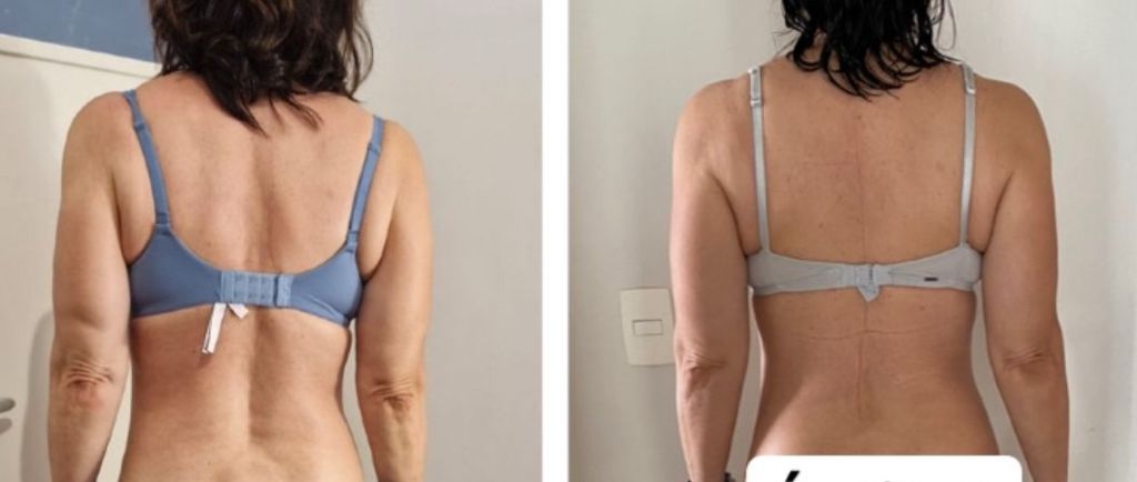 Fernanda chegou até nós com dores recorrentes nos joelhos e no ombro, além de incômodo estético pela postura desalinhada.